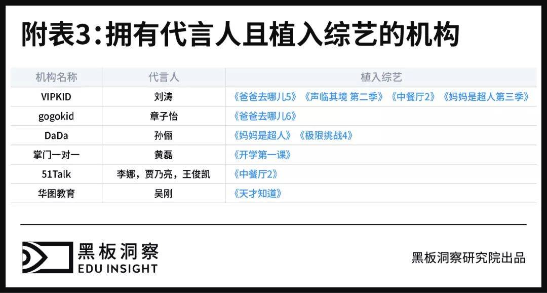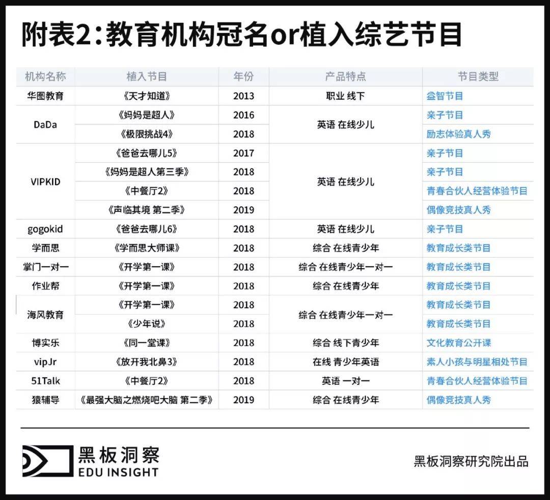 吸引流量的方式除了签约明星代言人以外,还有在综艺节目中进行植入。近年来,火热的综艺节目层出不穷,吸引了极多流量。于是,不少教育机构选择在综艺节目中植入,植入的节目大都属于亲子类和教育成长类,符合教育机构的品牌形象,对增长用户也有着很大的帮助。有些教育机构甚至既签约了代言人,又植入了综艺节目,宣传力度大,有利于快速获得关注度。