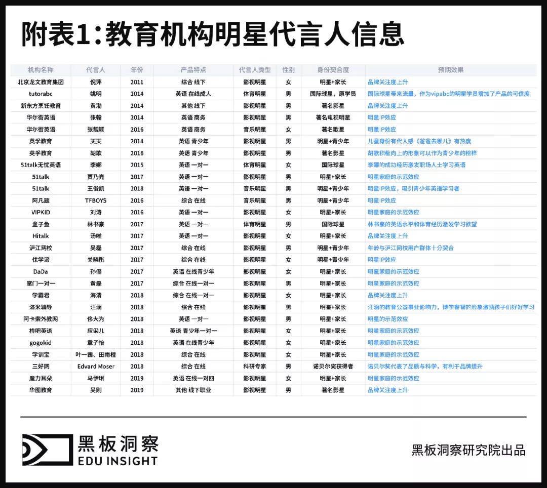本次,黑板洞察收集了26起签约了明星代言人的事件,通过梳理比较,来探讨明星代言人为何会成为教育机构宣传的重要部分,以及分析教育机构在签约明星代言人时的考量。