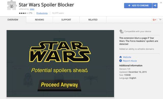 在《星球大战7:原力觉醒》上映之际,为了躲开猖狂的剧透党,有人开发了反星战剧透的Chrome扩展,直接屏蔽有星战剧透的网页。