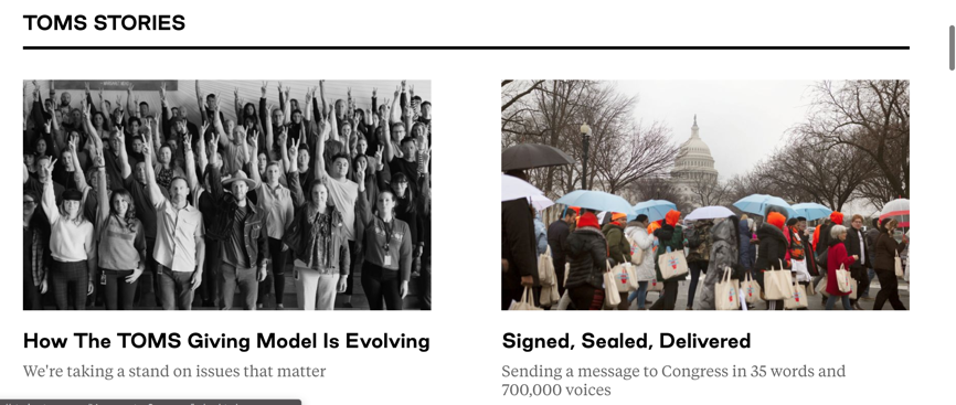 在美国创立的消费品牌中,有一家企业颇为独特:TOMS。这家公司的创始人在一次旅行后发现阿根廷的孩子有很多赤脚在街上奔跑,鞋子的缺乏造成了许多健康问题。他为此创立了一个“卖一捐一”(One for one)的独特商业模式——TOMS的鞋子以阿根廷当地的草鞋为原型设计,每卖出一双,他们就捐一双给阿根廷及其他发展中国家和地区的孩子。