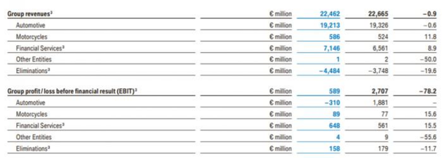2. 宝马集团公布了2019年一季度财报。今年一季度,宝马集团营收为224.62亿欧元,同比下滑0.9%,息税前利润为5.89亿欧元,同比下滑高达78.2%。其中,汽车业务息税前利润为-3.1亿欧元,上年同期为18.81亿欧元,汽车业务利润率为-1.6%,而去年同期为9.7%。这是宝马集团汽车业务自2009年后一季度首次出现亏损。