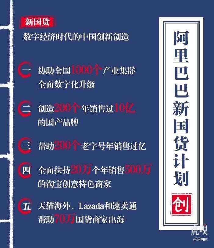 2. 今天阿里发布新国货计划:协助全国1000个产业集群全面数字化升级;创造200个年销售过10亿的国产品牌;帮助200个老字号年销售过亿;全面扶持20万个年销售500万的淘宝创意特色商家;天猫海外、Lazada和速卖通帮助70万国货商家出海。