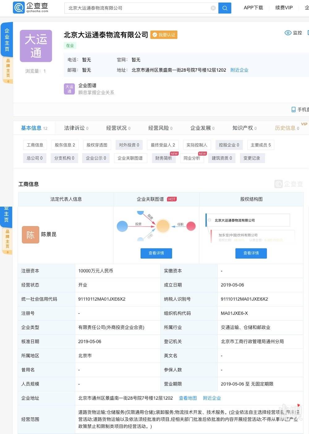 5月8日,企查查数据显示:北京大运通泰物流有限公司成立于5月6日,法定代表人陈景昆,注册资本1亿人民币,加多宝(中国)饮料有限公司为最大股东,持股比例60%,认缴出资额6000万。第二大股东为东莞通汇物流有限公司,持股比例40%,认缴出资额4000万。经营范围主要包括道路货物运输;仓储服务(仅限通用仓储);装卸服务;物流技术开发、技术服务等。