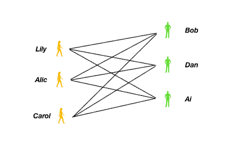 关于动态规划求最优解,历史上有著名的男女配对案例,下图左侧3名女孩,右侧3名男孩,连线代表他们互相喜欢,如果将互相喜欢的进行两两配对,问最多可以配出多少对?