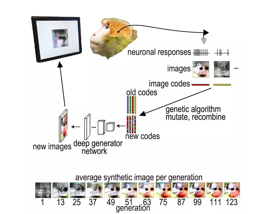 研究团队将微电极阵列植入六只猴子的下颞叶皮质 (耳朵上方稍微靠后的区域),向它展示图像,并测量猴子在观看图像时单个视觉神经元的放电率。GAN每次随机生成40个图像,其中有10张是令给定神经元或神经元群中最活跃的图像。另外30张是由遗传算法根据神经元的不同反应,对这10张图片中的元素进行重新排列组合生成的类似图像。