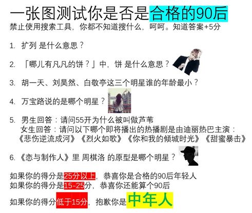 在微信群,流传着一份“测试你是否合格的90后”的问卷,其中的6个问题有4个与娱乐明星直接相关,2个与网红相关。出题者宣称:只有答对其中5个问题,才能算合格的90后。对于大部分70后和80后来说,这份问卷如同天书,一句话都看不懂。滑稽的是,许多货真价值的90后也无法正确回答,被归入“中年人”群体。