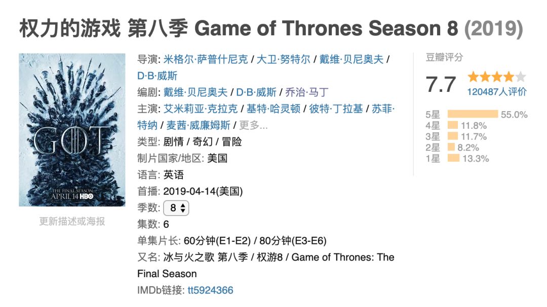 《权力的游戏》口碑有如高台跳水,大结局播出之后,也未能挽回颓势。