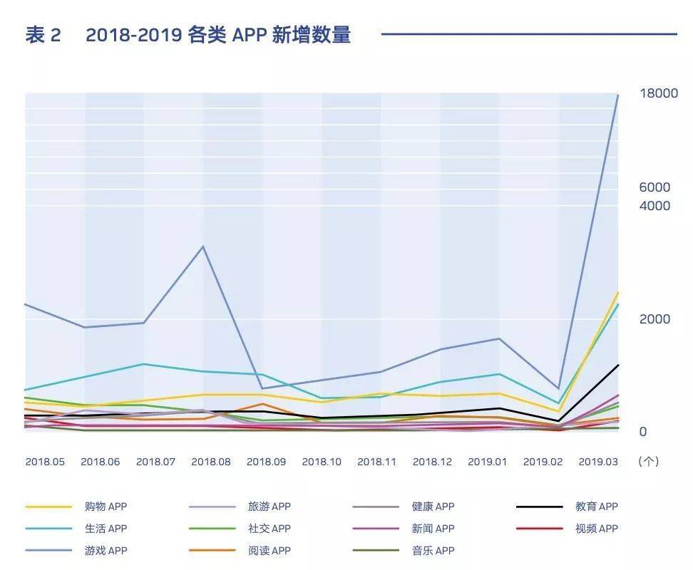 纵向看18年到19年春节之前各类别APP新增数量的数据,除了游戏、生活、购物这些在第一和第二梯队的类别有比较高的新增幅度以外,大部分类别的APP数量在2018年都维持着一个比较稳定的增长态势,有部分类别的APP新增速度在明显放缓,如旅游、健康、社交类。
