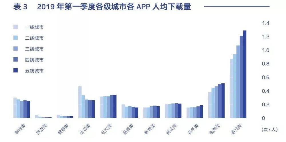 第一梯队(人均下载量0.3以上):游戏 第二梯队(人均下载量0.1-0.2):视频、社交、购物、生活、阅读
