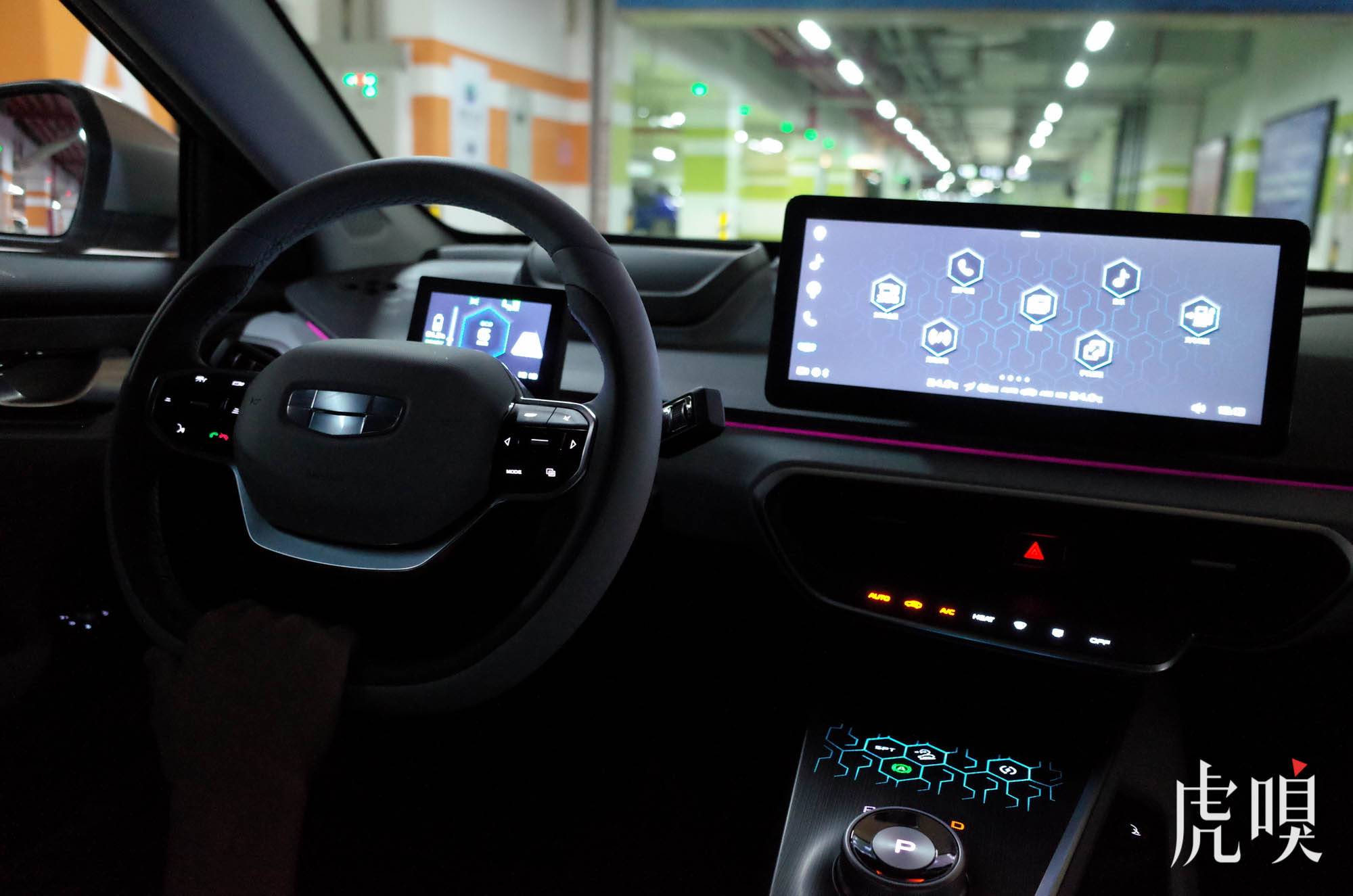 最具代表性的是内饰中控部分,几何 A 的中控按键采用全触控操作(官方称“E-touch中央超感触控区”),表明没有任何标记或凹凸。熄灭时藏身于面板呈现一体化效果,点亮时配以六边形装饰和各色灯效,在夜间与室内的视觉效果堪称科幻。