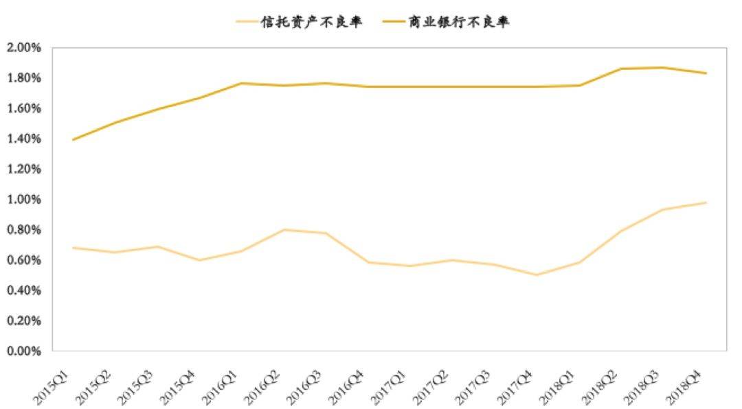 一方面,信托的不良违约率远低于同类资产。中国信托业协会数据,信托资产风险率长期低于0.80%,虽然2018年第三季度不良资产率稍有提升,为0.93%,但仍旧维持在1%以下的较低水平,远低于同期商业银行不良率。