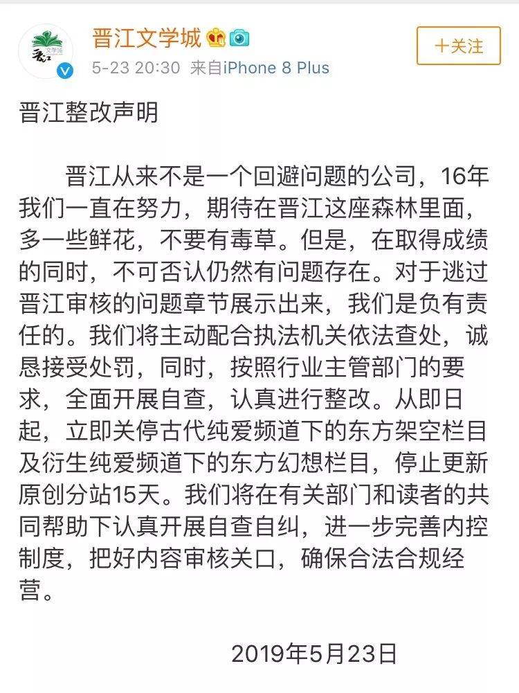 接到群众举报,5月23日,北京市“扫黄打非”办公室联合各级单位对晋江文学城网站进行检查。晋江文学城于当天发布整改声明。
