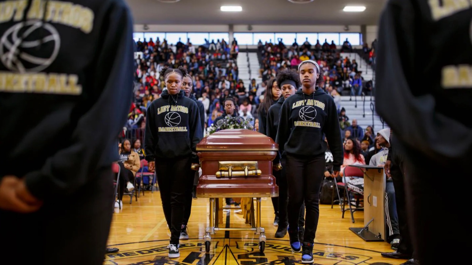 这场“葬礼”是自愿参加的,但体育场的座位还是被坐满了。随着福音歌曲“Broken But I’m Healed”,学生们找到座位并逐渐安静下来。