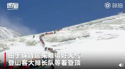 视频里,穿着醒目冲锋衣的登山者在高耸的悬崖峭壁上排起了长龙一样的队伍。