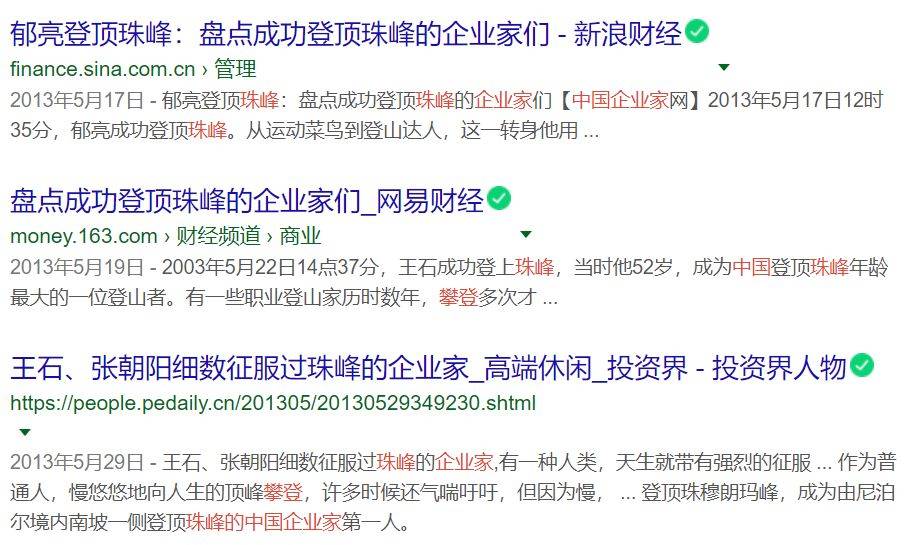 王石之后,郁亮、黄怒波、张朝阳、史玉柱、王秋杨、王静等也相继登上珠峰。