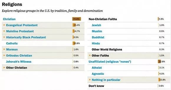 美国宗教人口分布情况。图片来源:皮尤研究中心