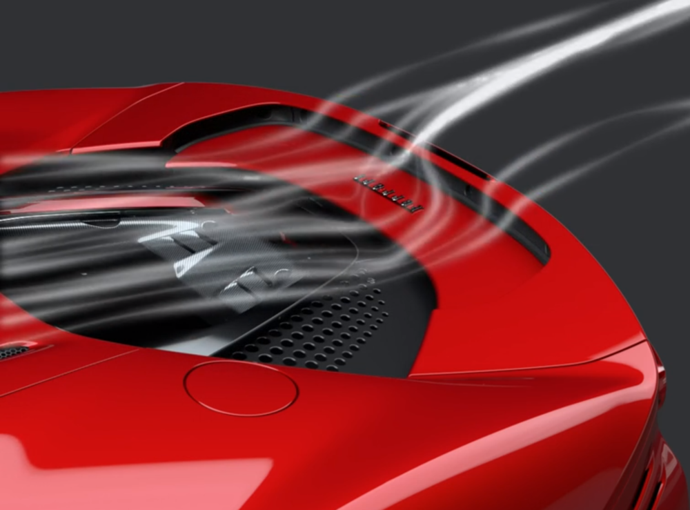 在这样的速度下,自然离不开良好的空气动力学设计。SF90 Stradale 作为法拉利的非限量常规车型,恪守无大型尾翼的不成文原则。在车尾,法拉利设计了复杂的主动式空动系统。被戏称为 Shut-off Gurney 的中央可动面板,可以在刹车及转向时降下,阻断原本镂空的翼片下方区域,减缓上方气流流速,使下方形成低压区产生下压力。