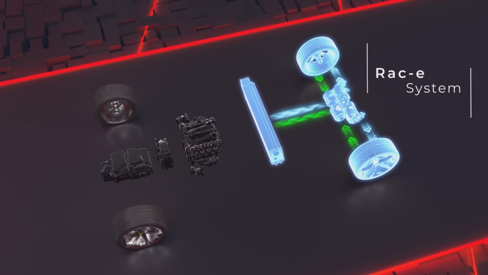 三台电动机中,一台仍与发动机、变速箱组合驱动后轴,另外两台位于前轴。前轴电机还接管了倒挡功能,倒车仅使用电驱动,于是 8 速双离合变速器抛掉了倒挡齿轮组件,这为变速箱减重 3kg。前轴双电机,还使得过弯时可以单独调节左右前轮扭矩。7.9kWh 电池组横向布置于座位与发动机之前,纯电模式下提供 25km 续航里程,最高纯电车速 135km/h。