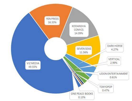 收益份额情况和销量份额情况大体相当,最大的依然是VIZ MEDIA,占49.55%。其次是YEN PRESS,占16.33%。第三和第四分别是讲谈社漫画和SEVEN SEAS,占14.09%和11.56%。