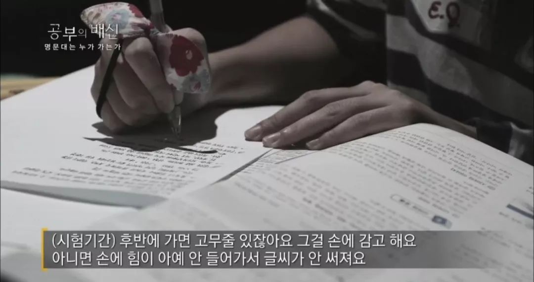 允艺媛用橡皮筋将手和笔绑起来,好更标准的写字,《学习的背叛》