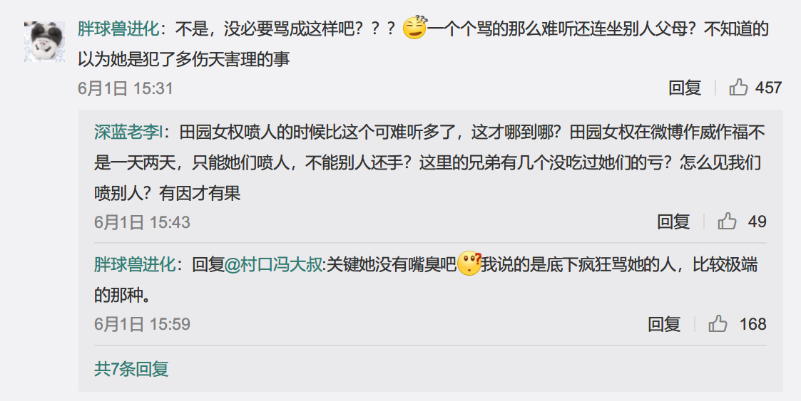 田园女权攻击不符合她们价值观的一切,反过头来,网友们也对(疑似)田园女权赶尽杀绝,没有谁比谁更无辜。