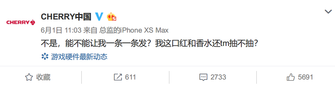 而 CHERRY 中国,直接用蓝 V 账号——而不是运营人员、CEO 的个人账号——下场参与骂战,甚至激化了矛盾,这就是一个值得商榷的做法了。