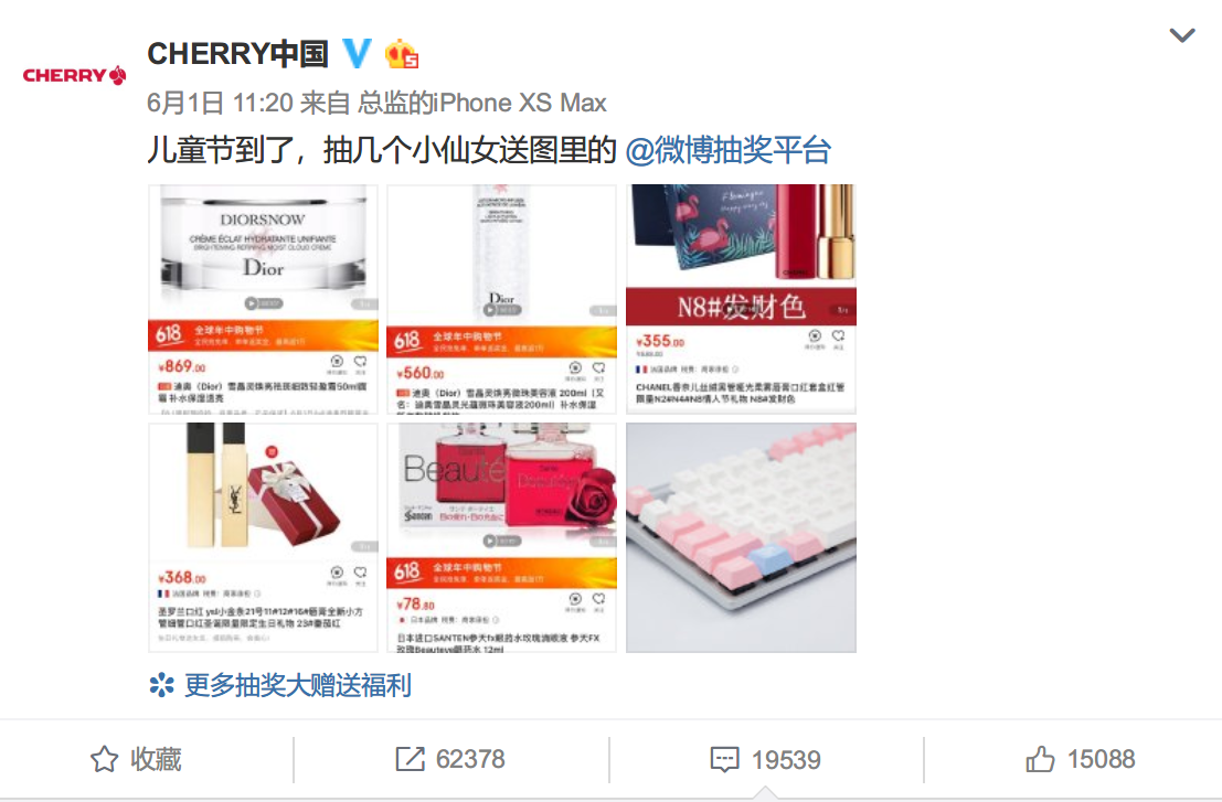 但 CHERRY 中国没有“收手”的意思,随后又发表了新的微博,抽了一轮口红与香水: