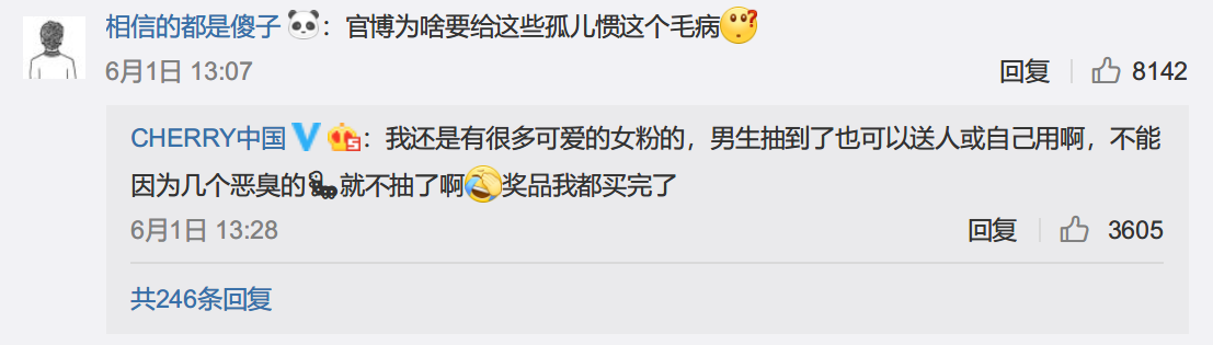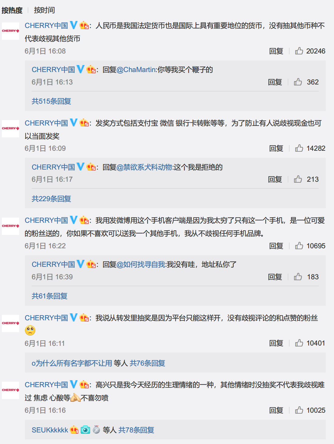 在随后一条微博中,运营人员连续用反讽的形式,讽刺了那些认为抽奖是“歧视”的网友,同样的,这条微博评论也超过了 20000,CHERRY 中国在当天喜提热搜。