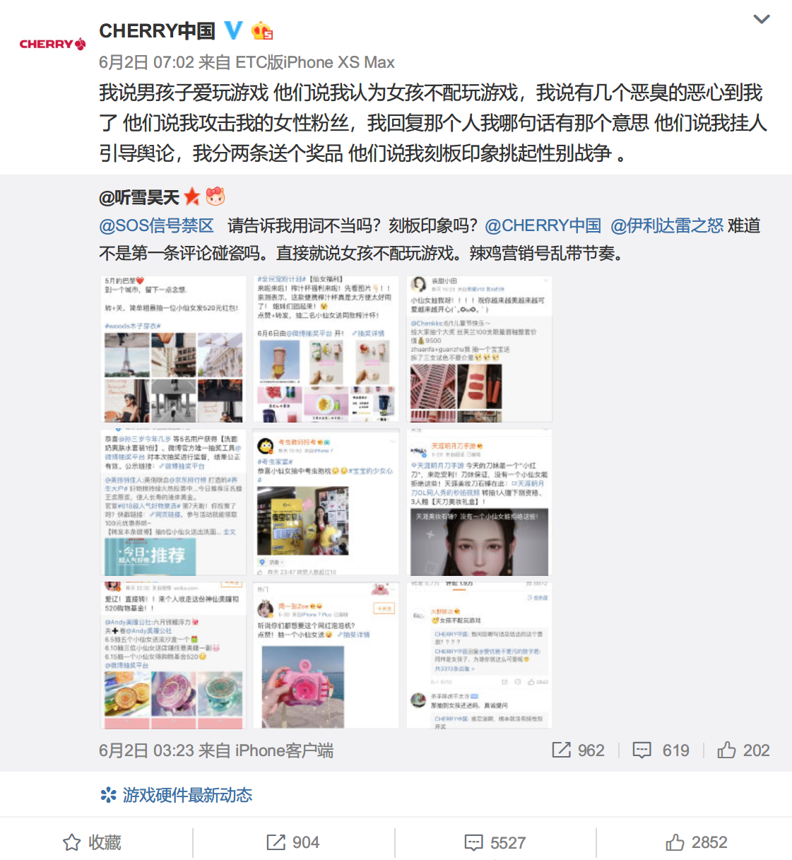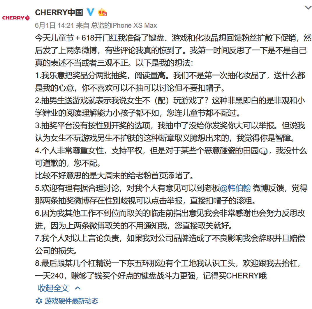 事件的起源是一则抽奖微博,时逢六一儿童节,各大品牌都会在这个日子推出些营销活动,CHERRY 也不例外。这则微博中,CHERRY 中国选择抽几位“男生”送出机械键盘及几款游戏:
