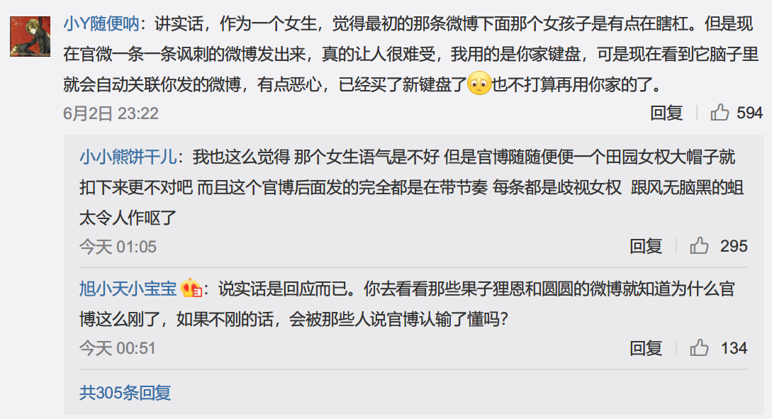 女权在微博上历来都是敏感话题,一点就着,随后事态的发展已经不是 CHERRY 中国能控制的了,留言质疑的网友,很快遭受了大规模的人身攻击,其中不乏不堪入目的污言秽语。与此同时,攻击“田园女权”的男性网友,自然也有被回怼的。