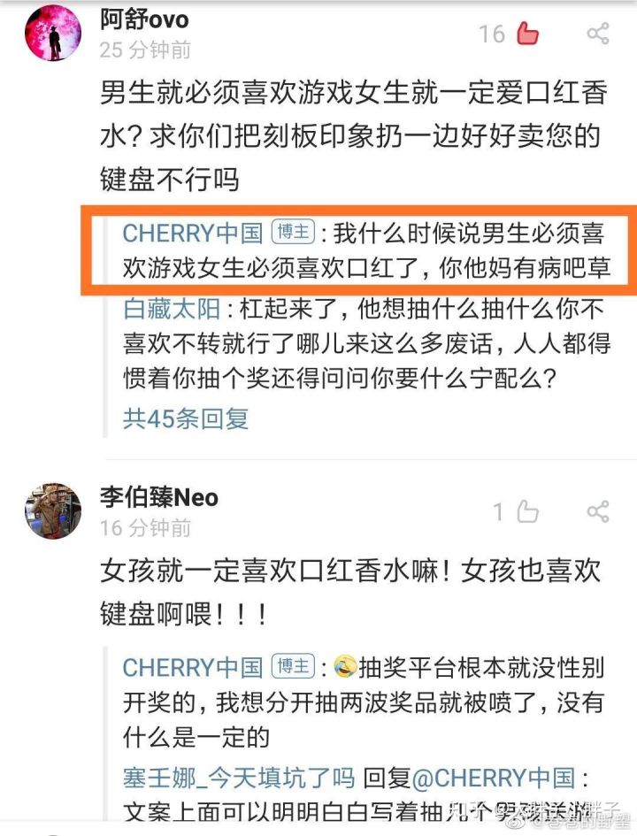 这看起来似乎是一则再正常不过的抽奖微博,没什么不妥。不过,也正是这样一条微博,引发了一场闹剧。因为抽奖的微博文案,多次强调游戏和键盘的抽取对象为“男生”,引发了一些女性网友的不满,认为这是“刻板印象”,乃至“性别歧视”,点赞最多的回复,用反问的语气提出质疑:“女孩不配玩游戏?”