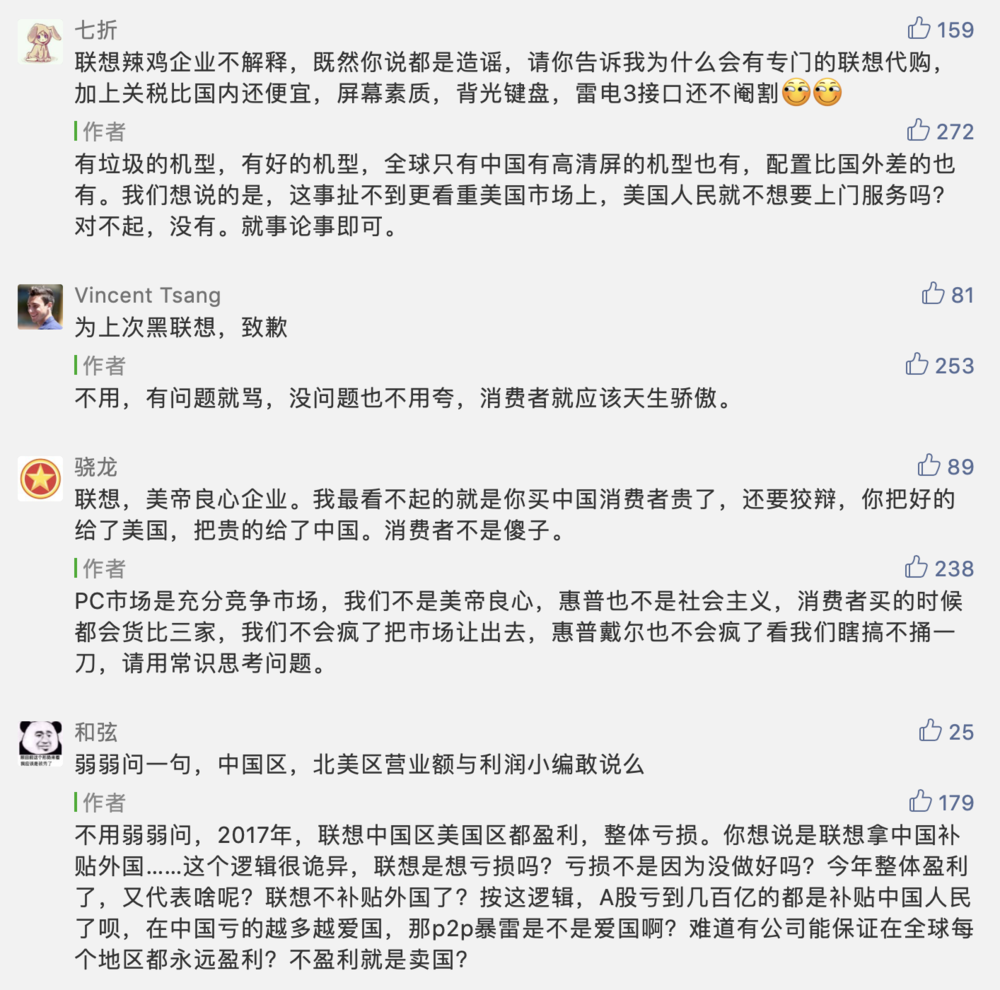 另外一个案例是联想,因为一些众所周知的原因,联想的品牌形象一直不算好,网友们将其调侃为“美帝良心想”。上个月,联想运营人员在公众号评论区开始与网友“硬刚”,不过联想还算是理性讨论,也没有飙脏话: