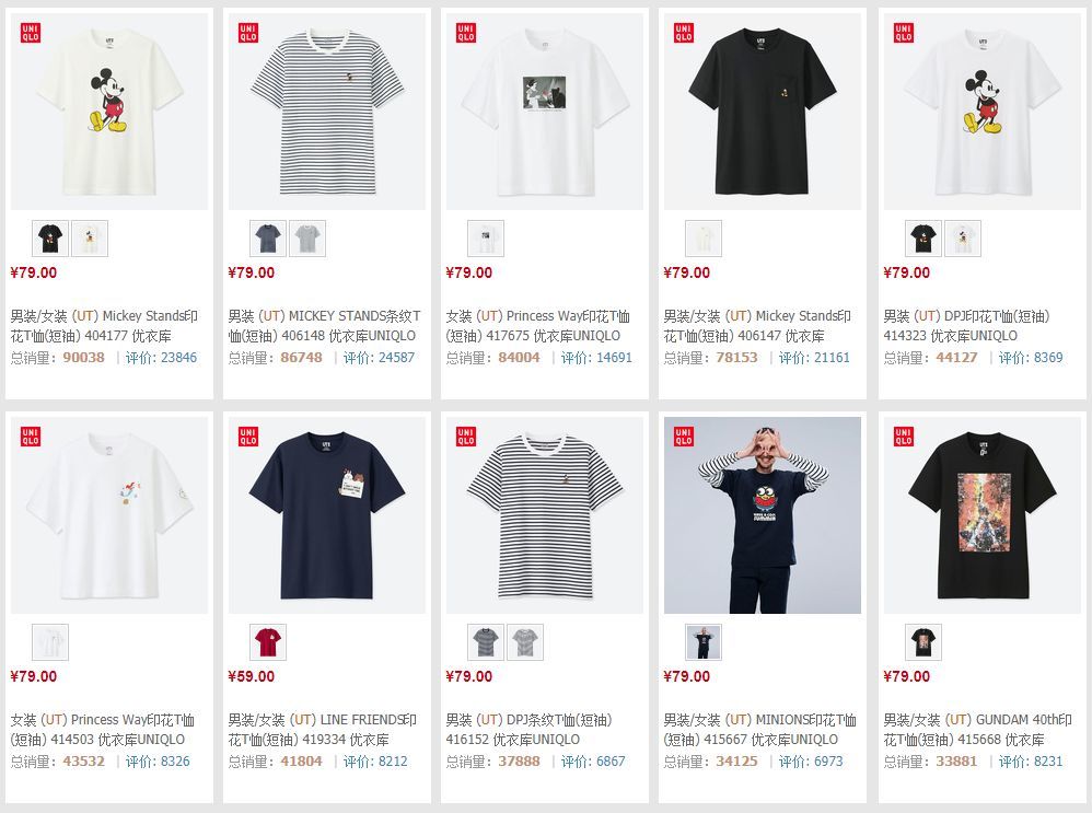从优衣库目前天猫官网在架的产品销量来看,销量前十的UT都卖出了几万件,最受大众欢迎的UT来自迪士尼的米奇、迪士尼公主、Line Friends、小黄人和高达等知名卡通IP。