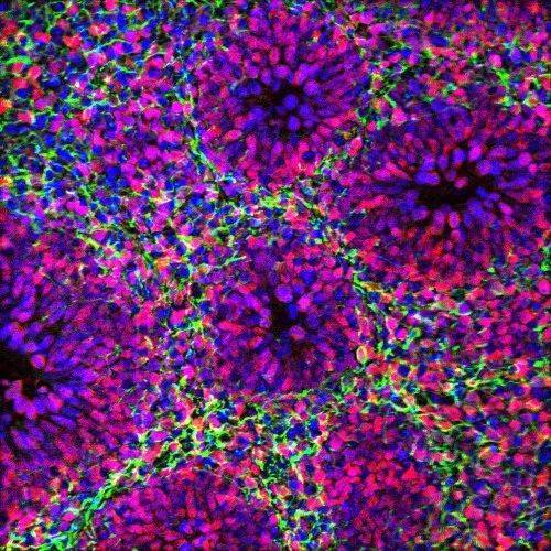 在培养1个月的细胞团块中,可以看到不同类型的细胞,包括将成熟的神经元(图片来源:Paola Arlotta laboratory, Harvard University)