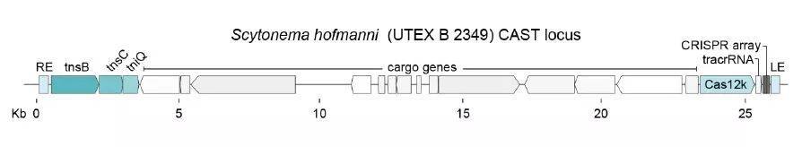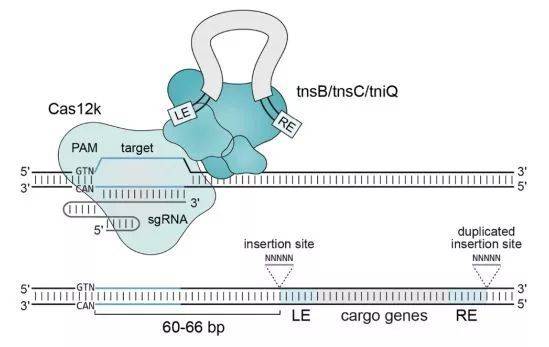 CAST基因座一端包含转座酶基因,一端包含CRISPR序列和Cas12k,中间是待插入的基因