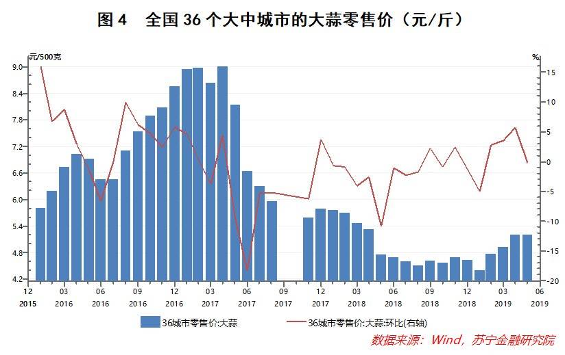 从数据上看,进入2019年以来,全国36个大中城市的大蒜零售价格虽然有所上涨,可距离2016年的历史高点还有相当大的差距,而在环比增速上,最近也出现了逐渐放缓的苗头(参见图4)。