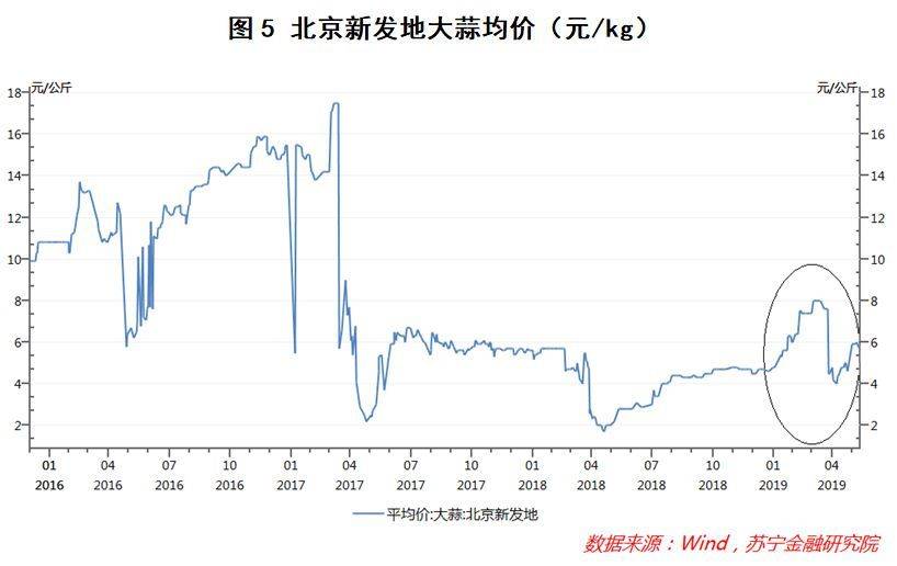 再看北京新发地的大蒜均价,虽然上半年有所波动,但整体上仍处于相对合理的价格区间内,值得注意的是,近日的价格已经出现了下降(参见图5)。