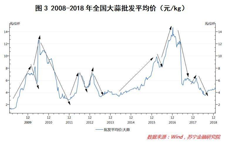 事实上,倘若拉长时间轴,根据已有的统计数据,大蒜的价格走势整体上呈现出颇为明显的周期性涨跌规律(参见图3)。换句话说,大蒜价格不会一直涨,也不会一直跌,只是每次涨跌的幅度有所不同。