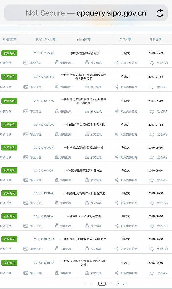不过查询国家知识产权局专利检索系统,尚未发现名为“今珠多糖注射液”的相关专利,而许启太名下目前拥有的专利大多与槟榔有关,涉及槟酚香烟、无毒咀嚼槟榔、槟榔豆干、槟榔口香糖、槟榔炭烧咖啡、槟榔可乐等。目前许启泰名下的几家公司也都是与槟榔产业相关。