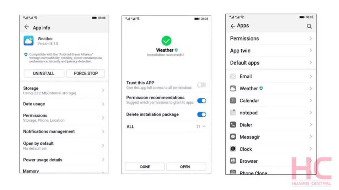 除了用户界面,屏幕截图还提到了“安卓绿色联盟”,这是一个包括华为、阿里巴巴、百度、腾讯和网易在内的开放非盈利组织,旨在共同提升中国安卓应用体验。但该消息目前没有获得任何官方确认。