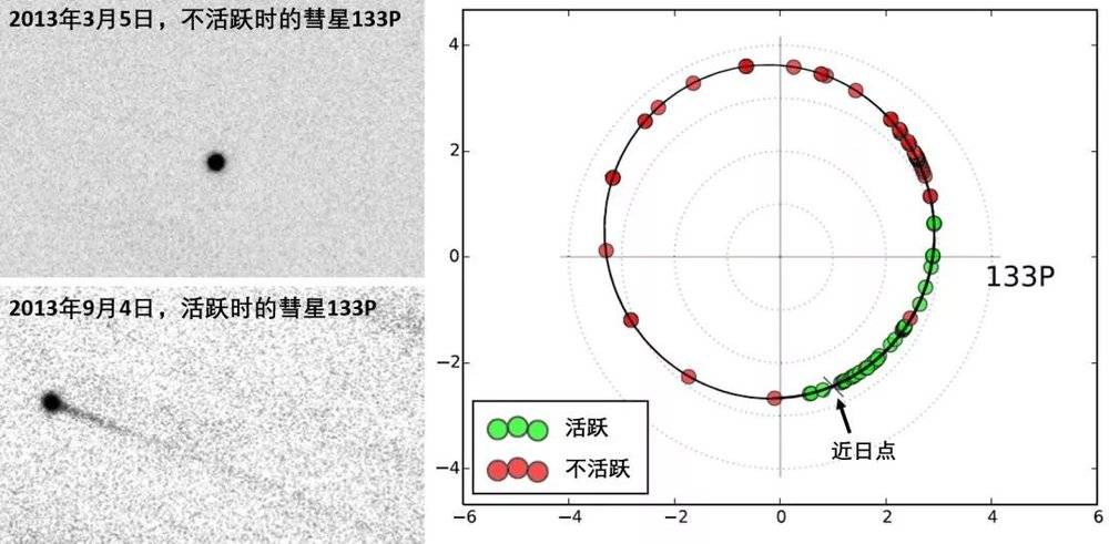 133P/Elst-Pizarro每到近日点附近就会开始活跃,这和传统彗星因为水冰受热挥发而产生彗发彗尾的过程似乎并无二致 | 论文[11]