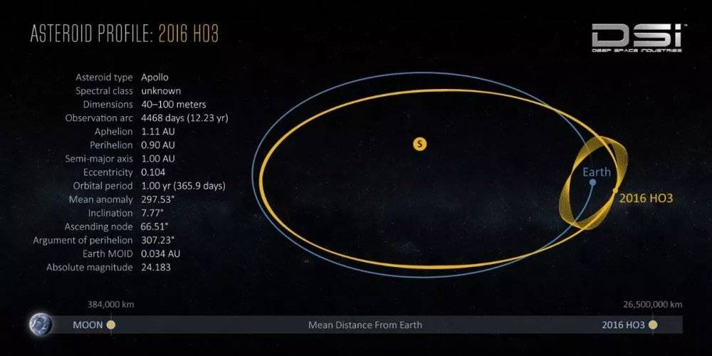 近地小行星 2016 HO3是一颗阿波罗型小行星,这类小行星会运行到地球轨道内部去,因此有时会非常靠近地球,是从地球出发的探测器比较容易在短时间内探访的一类小行星。JAXA的隼鸟号当年探访的糸川(25143 Itokawa)、隼鸟2号正在探访的龙宫(162173 Ryugu)、NASA的冥王号正在探访的贝努(101955 Bennu),都是阿波罗型小行星。