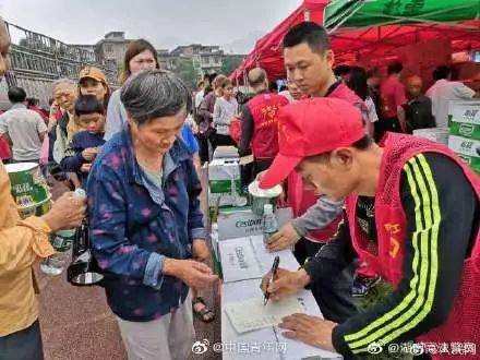 第一批救灾物资到达四川省长宁县双河镇中学居民安置点,群众排队领取救灾物资
