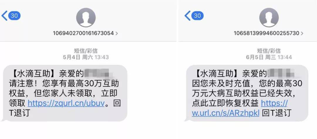 2019年4月,陈永超(化名)在一次水滴筹捐款活动中为朋友的妈妈捐款后,收到了水滴互助的短信,短信称其享有最高30万元互助权益,请立即领取。