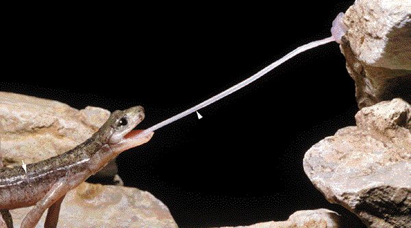 在不到五毫秒的时间里,一只穴螈属(Hydromantes)的动物可以把舌头弹射出嘴巴,抓住一只正在飞行的倒霉虫子。这是两栖动物有尾目蝾螈亚目里的一种无肺螈,它的舌头包括肌肉、软骨和一部分骨骼。在两栖类当中,它是快速捕食项目的冠军。同样是用舌头抓虫子,受制于解剖结构,蛙类和变色龙的动作则相对要慢得多了。