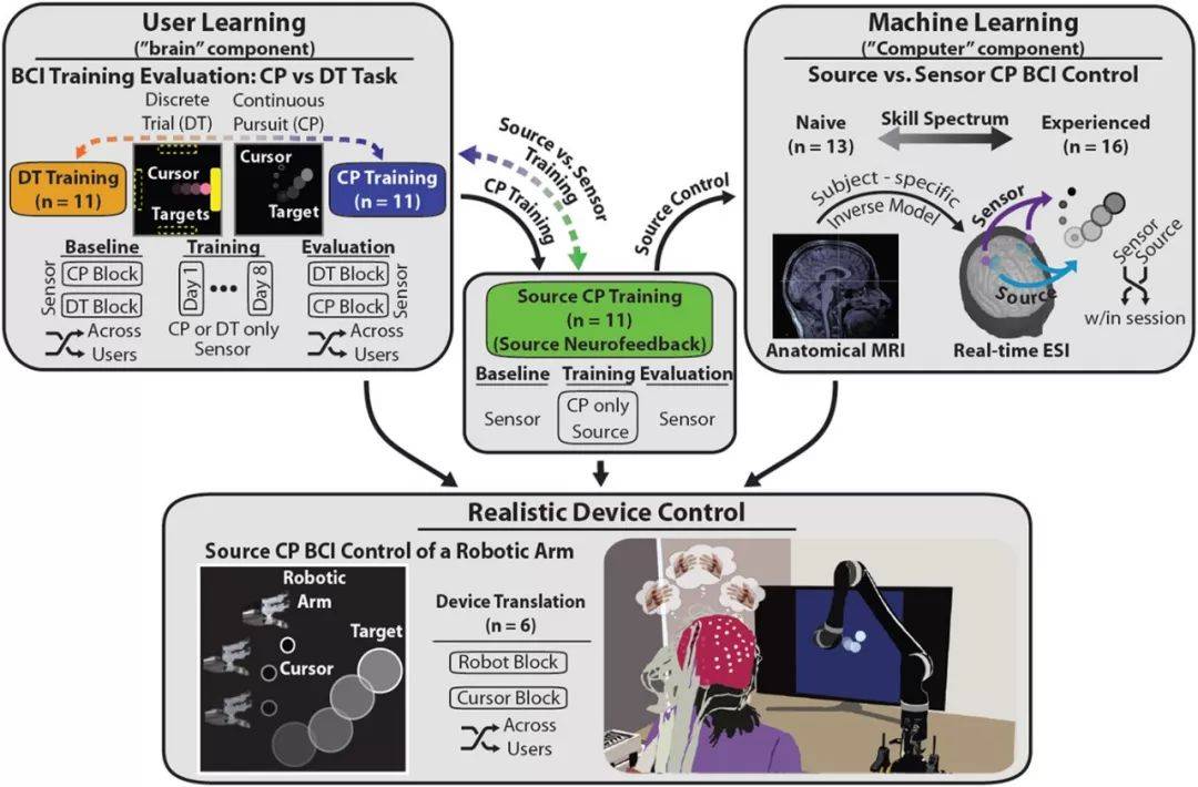 为了克服这个难题,研究团队采用了独特的解决方法:利用新型传感和机器学习技术,并通过人机相互适应的训练方法,分别增强脑机接口的“脑”部分和“机”部分,从而显著改善脑电图(EEG)源的神经解码。