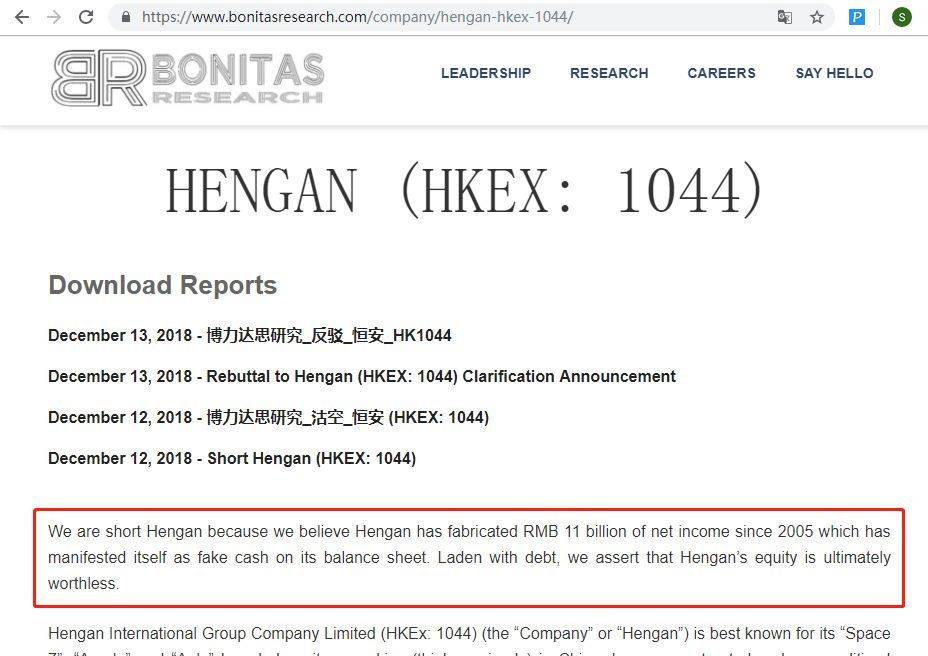 Bonitas去年12月12日的时候做空福建系扛把子之一——恒安国际(1044.HK),称其财报中现金项目作假,自2005年以来总共有110亿元的净利润皆系虚构,股票的合理价值应为零。这里是不是有点和今天说波司登“股票价值为零”的感觉似曾相识?