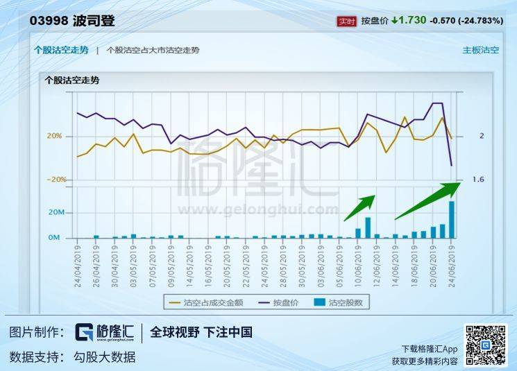 首先是布局空仓。从下面两幅图中可以看到,从5月下旬开始,波司登的沽空比率便提升到20%左右维持。沽空比率长期居高不下,随之而来的往往就是沽空报告。