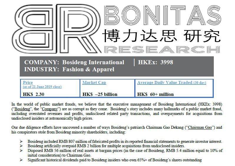 Bonitas认为,波司登存在欺诈发行,其认为波司登国际的执行管理层一如既往地腐败。波司登的故事存在许多公开市场欺诈的情况,包括: