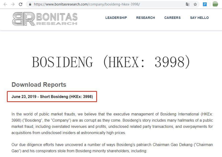 此次沽空一个容易被忽略的细节是,它的第一份沽空报告并不是今天上午公布的,而是1天之前,也就是6月23日(周日)。这在Bonitas Research的官网上发布的沽空报告时间可以看到(如下图)。